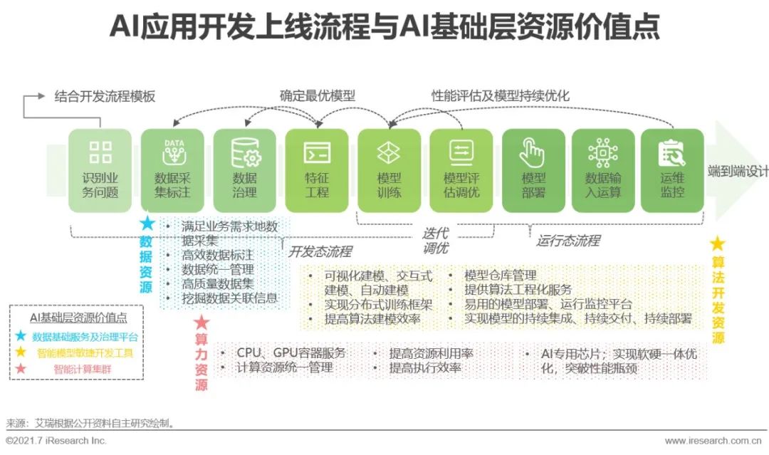 开发一项人工智能模型并上线应用大致需经历从业务理解、数据采标及处理、模型训练与测试到运维监控等一系列流程。过程中需要大量的AI算力、高质量数据源、AI应用算法研发及AI技术人员的支持,但大部分中小企业用户并不具备在“算力、数据、算法”三维度从0到1部署的能力,而财力雄厚的大型企业亦需高性价比的AI开发部署方案。依靠AI基础层资源,需求企业可降低资源浪费情况、规避试错成本、提高部署应用速度。作为支撑AI模型开发及落地的必要资源,AI基础层可在多环节提效AI技术价值的释放;其工具属性也标志着AI产业社会化分工的出现,AI产业正逐步进入低技术门槛、低部署成本、各产业深度参与双向共建的效率化生产阶段。